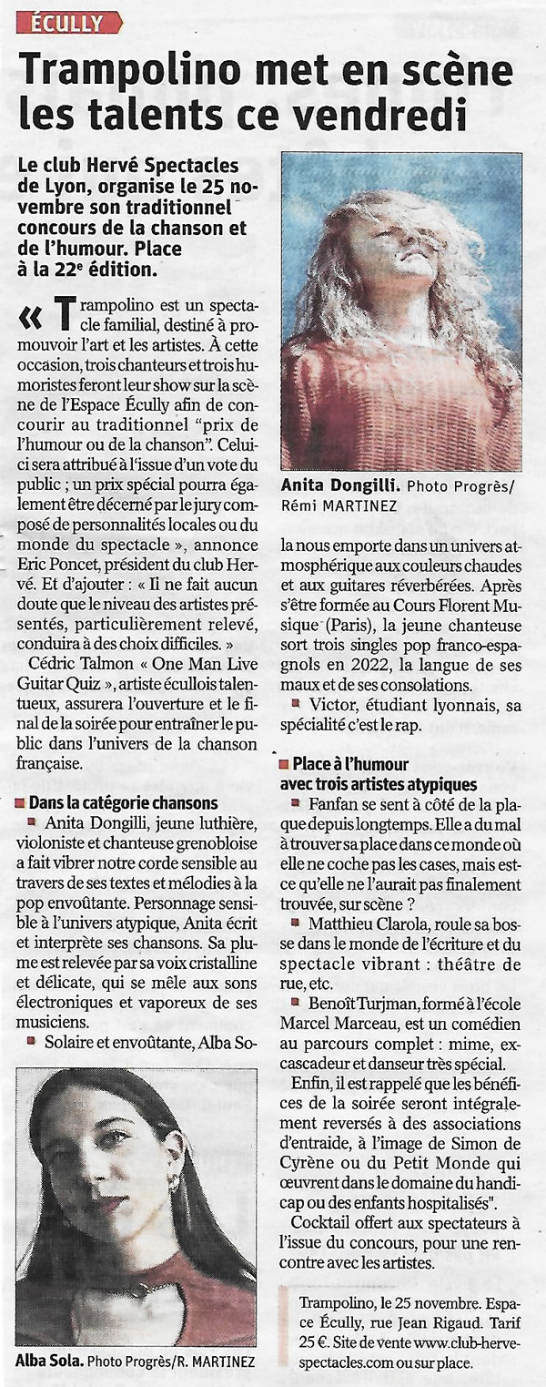 Rendez-vous le vendredi 25 novembre à l’Espace Écully pour la 22e édition de Trampolino, le tremplin de jeunes talents de la musique et du rire, organisé par le Club HERVE Spectacles.